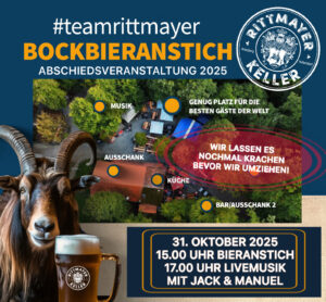 Die beiden Brauereichefs bedanken sich herzlich bei Steffen Ramer, seiner zukünftigen Frau Julia und dem gesamten Team für die wunderbaren Jahre, die unvergesslichen Veranstaltungen, das Engagement, die geleistete Arbeit und die Leidenschaft, den Rittmayer Kreuzbergkeller zu dem zu machen, was er heute ist: bekannt, gut besucht und ein geschätzter Treffpunkt für viele aus nah und fern.